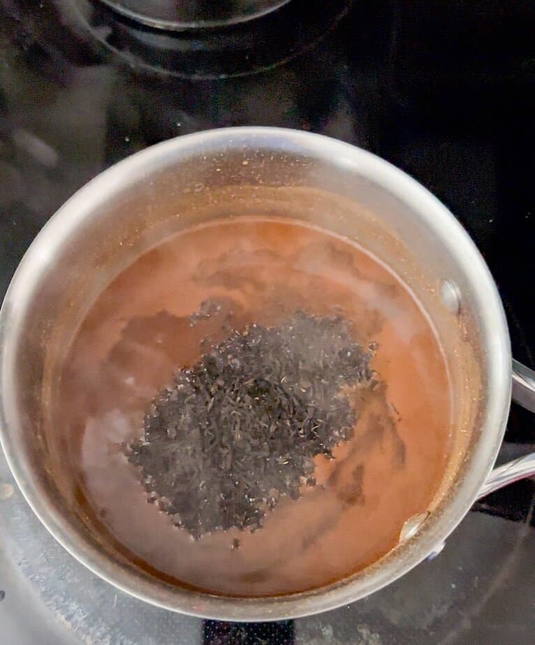 - Remove from heat and add the black tea to the mixture and stir to combine.